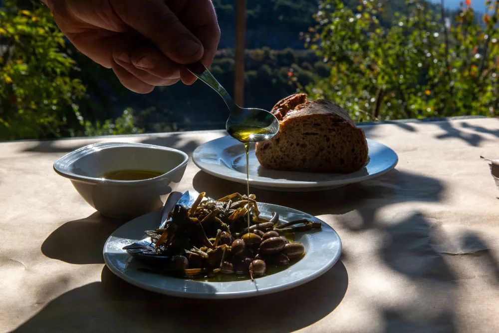 ↑在希臘伯羅奔尼撒半島麥西尼亞,一名男子往盤中加入橄欖油。