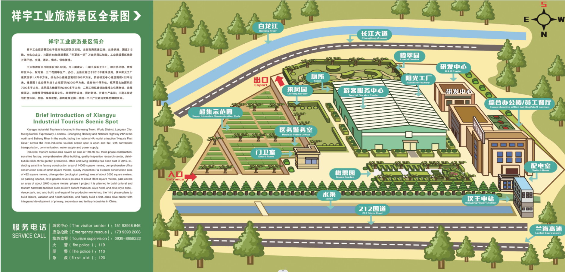 橄恩園、欖萃園、來鳳園(三處各具特色的油橄欖園林景觀);三中心即游客服務(wù)中心(為旅游者提供各項(xiàng)服務(wù))、